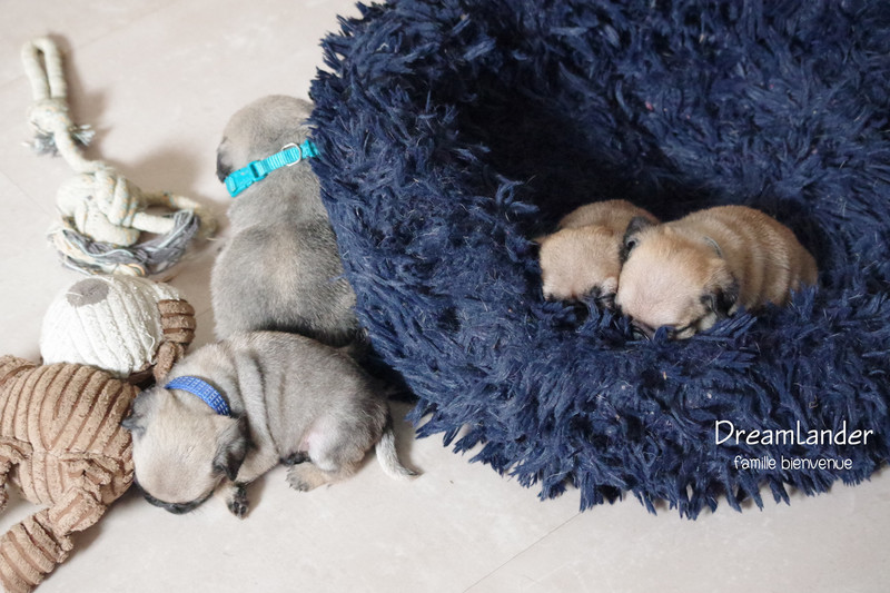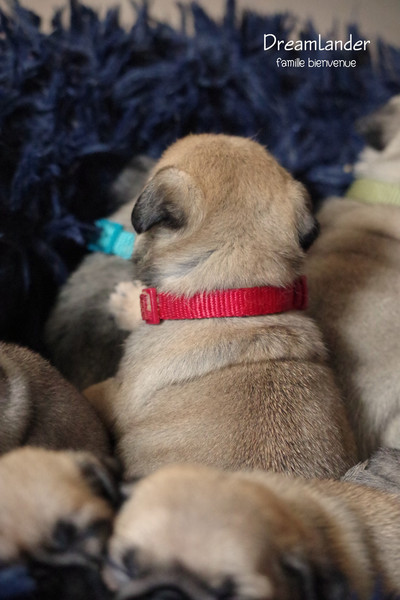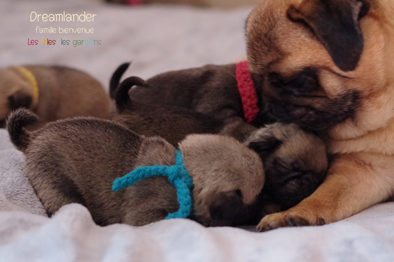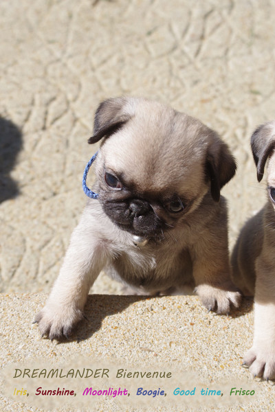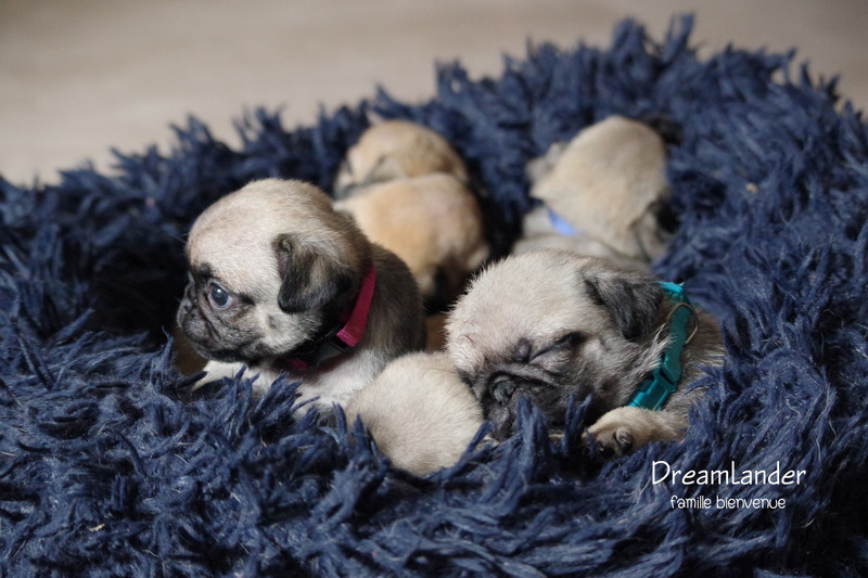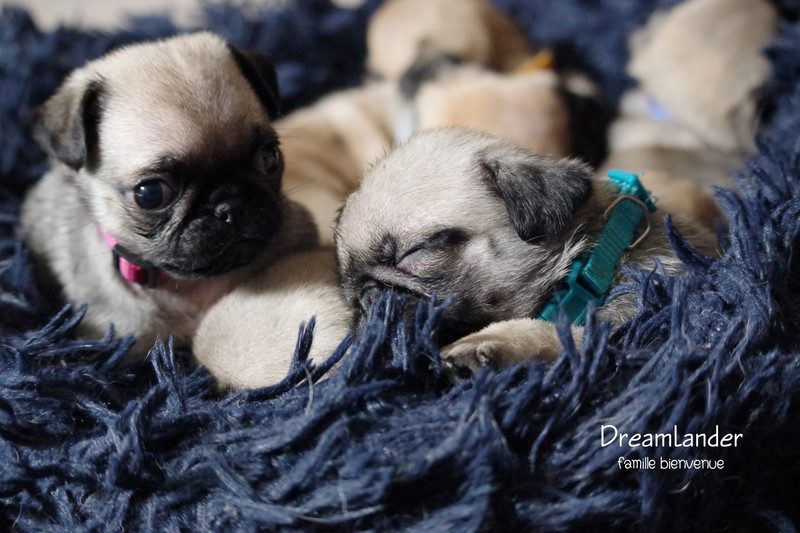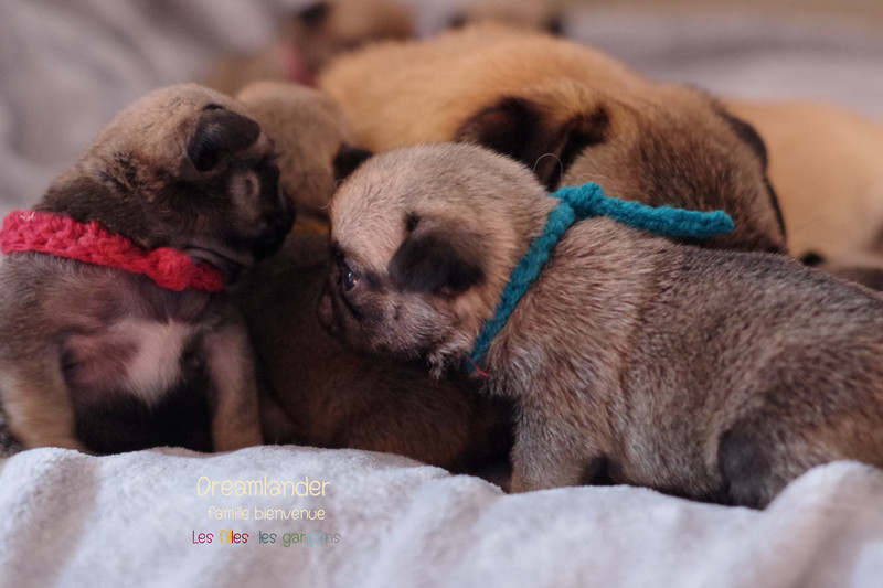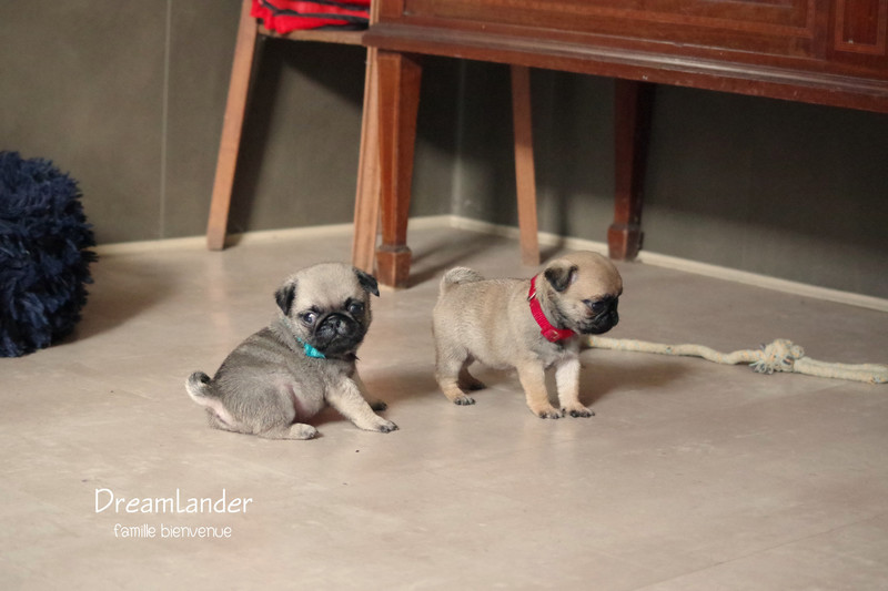 2 chiots carlin mâles : Dreamlander Good time, collier turquoise et Dreamlander Boss, collier noir, sont disponibles à la réservation. Ils pourront rejoindre leur famille à partir du 22 mars.