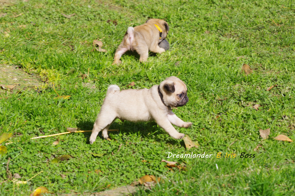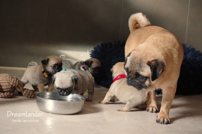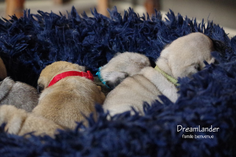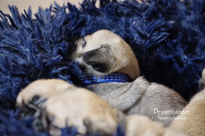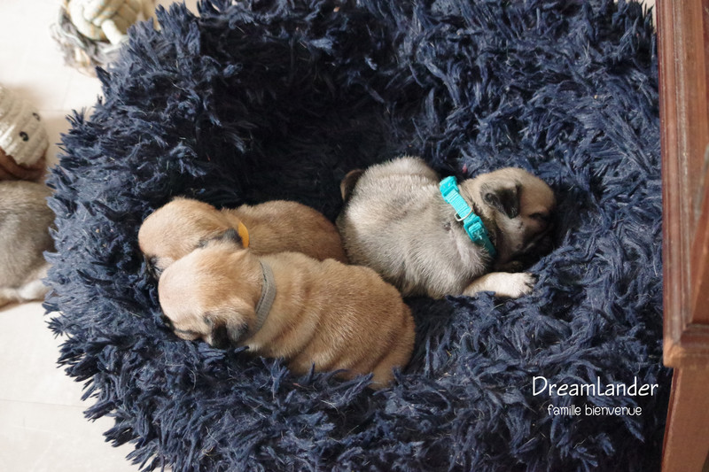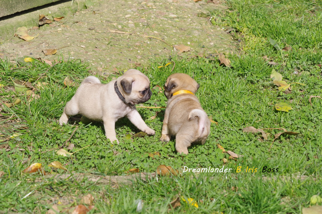 2 chiots carlin mâles : Dreamlander Good time, collier turquoise et Dreamlander Boss, collier noir, sont disponibles à la réservation. Ils pourront rejoindre leur famille à partir du 22 mars.